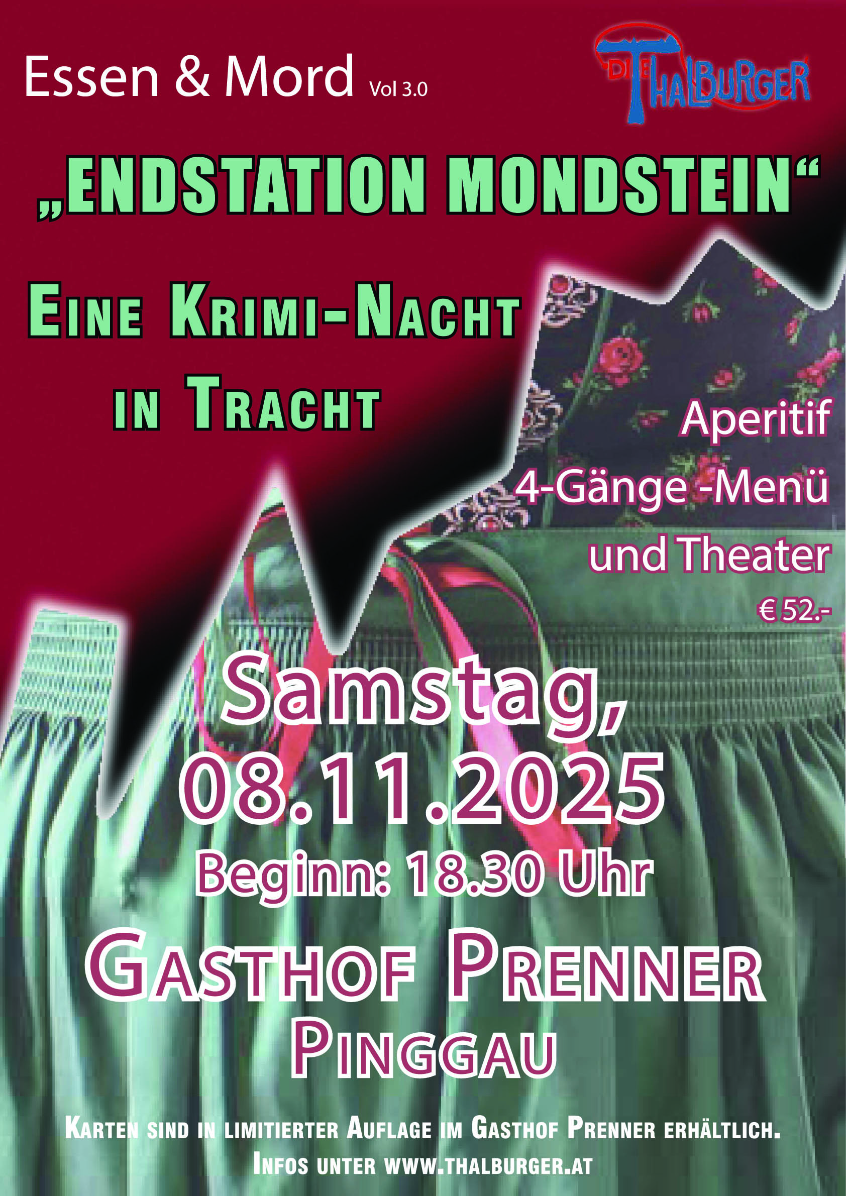 Kultur- und TheatervereinEssen und Mord Vol 3.0 „Endstation Mondstein“ – Eine Krimi-Nacht in Tracht ist der 3. Fall der Thalburger GH Prenner, Pinggau Tel. 03339 22361